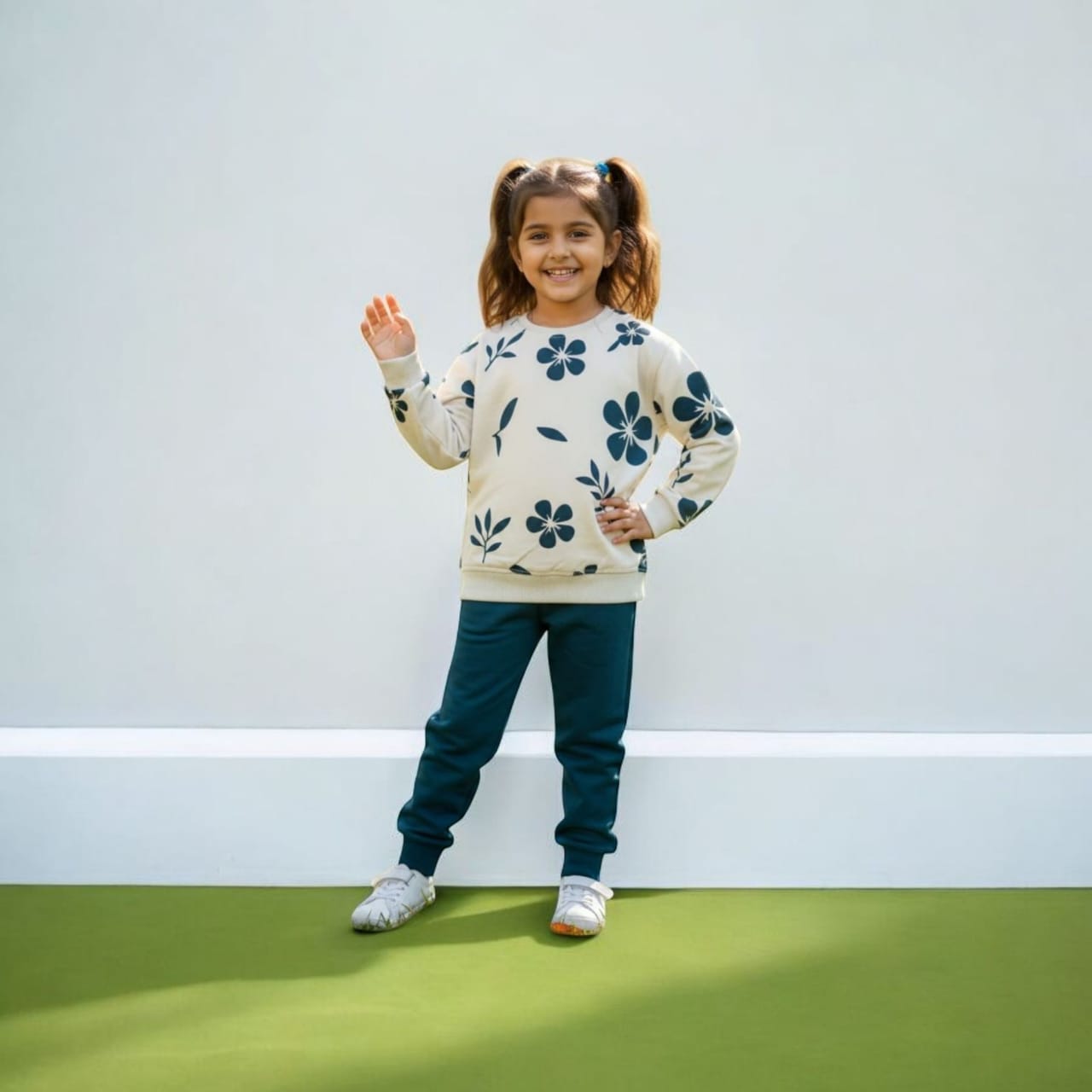 This elegant two-piece set features a cream-colored crewneck sweatshirt adorned with large, bold teal botanical and floral prints. Paired with matching deep teal joggers, this outfit offers a sophisticated yet playful look for active toddlers. Crafted from high-quality, soft-touch fabric, it ensures maximum comfort for all-day wear and play.
