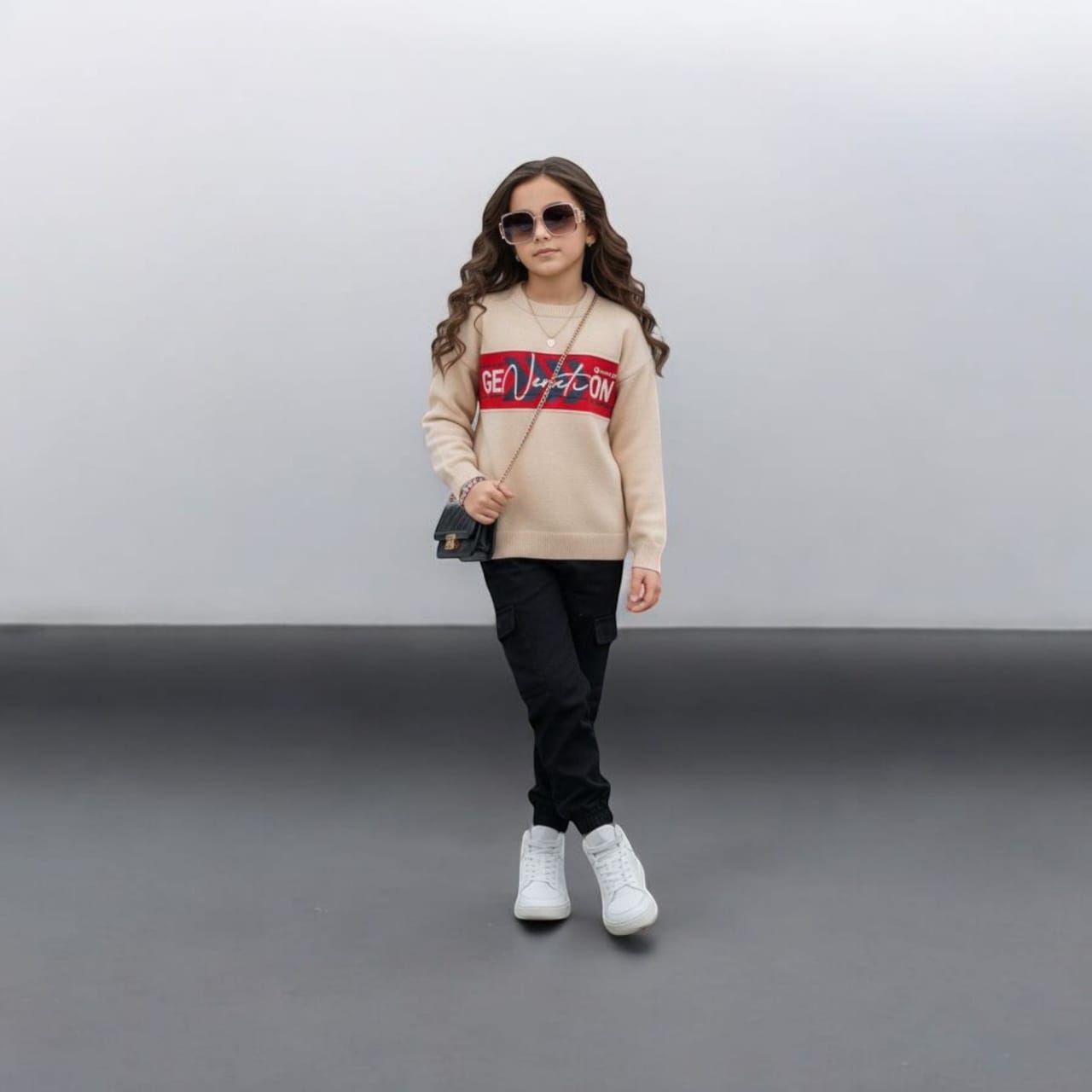This stylish tan knit sweater features a bold red and navy horizontal stripe across the chest with “GENERATION” script text. Designed for a modern, high-fashion look, it is paired with sleek black cargo-style joggers. Made from a soft, premium knit blend, this outfit is perfect for creating a trendy and comfortable street-style ensemble for older children.